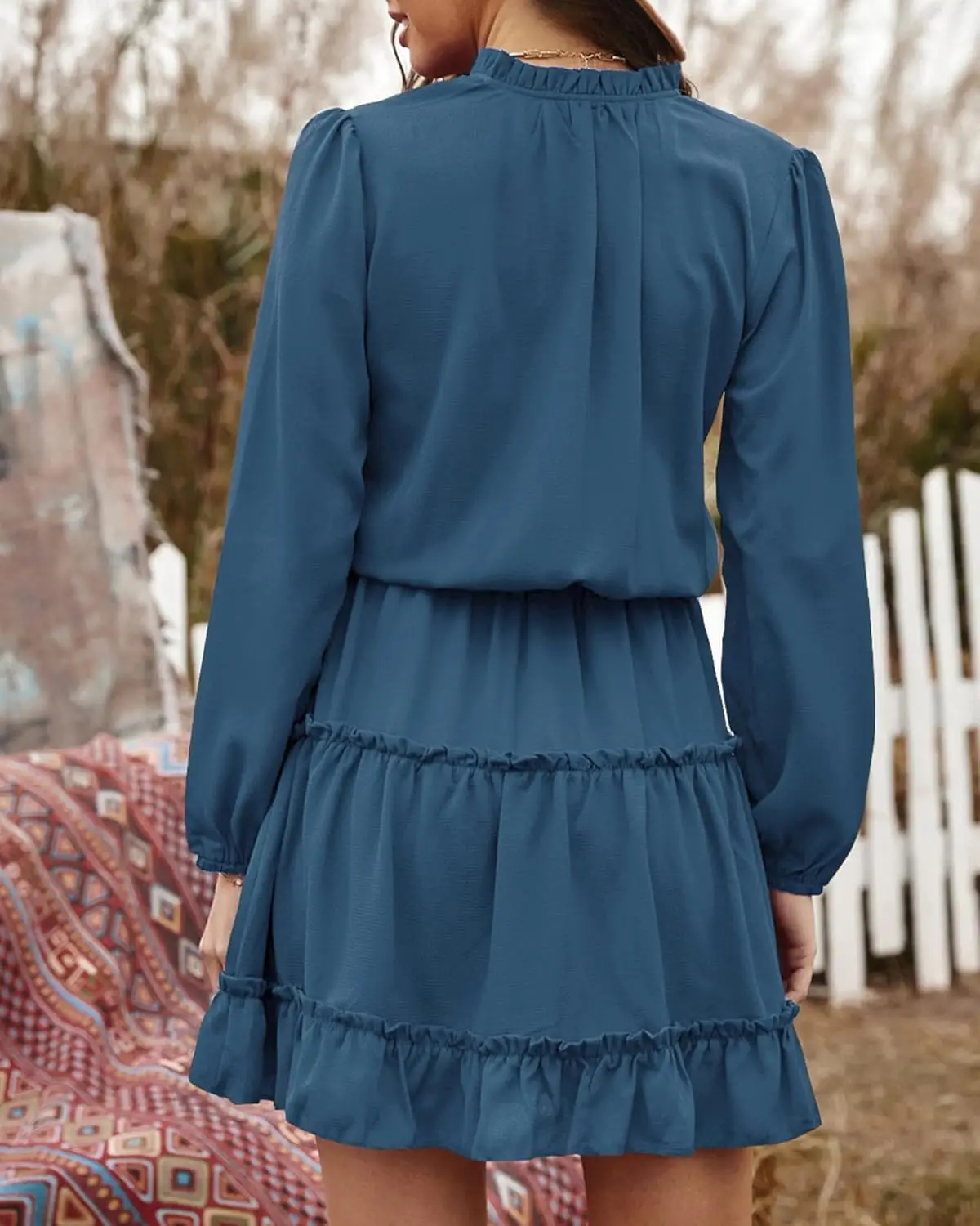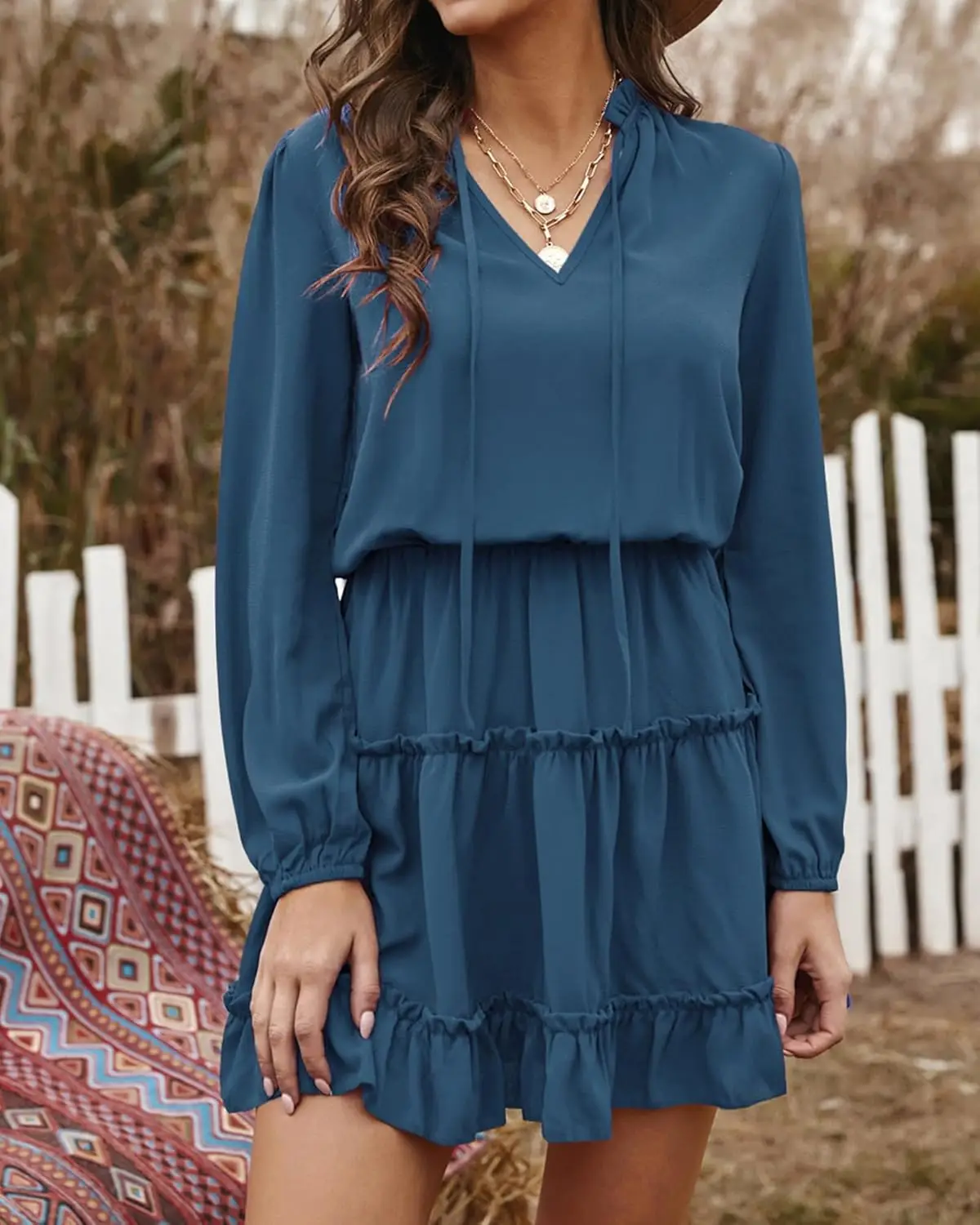 Summer Casual V-neck Party Guest Dress Women Long Sleeved Ruffle Chiffon Natural Waist Washable Solid Dyed Woven A-line Vintage